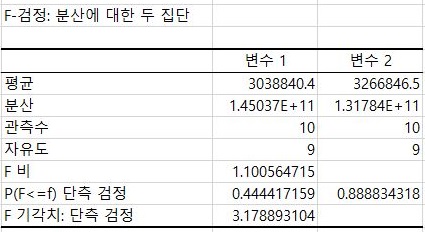 그리고 나서 먼저 F 검정을 해 보았더니, 여기서 하나 알 수 있는 것으로는 등분산이 제대로 성립할 정도로 P 값이 크다는 것 입니다.