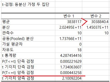 먼저 나온 F 검정의 결과를 제대로 등분산이 성립한다고 나올 정도로, 0.05라는 유의수준을 완선히 커버할 정도로 높게 나홨다는 것을 알 수 있었습니다.