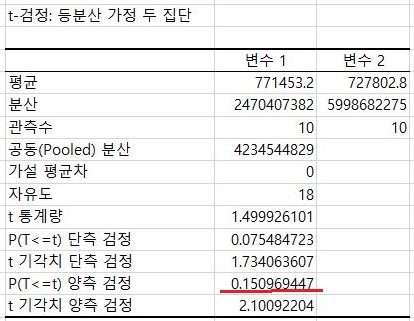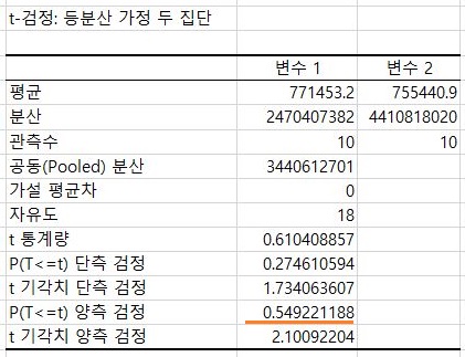 F 검정 결과는 위 스크린샷과 같이 P 값이 0.05를 한참이나 넘어가기 때문에, 일단 이에 대해서는 등분산이 성립한다는 가정으로 해서 앞으로 나아가야 합니다.