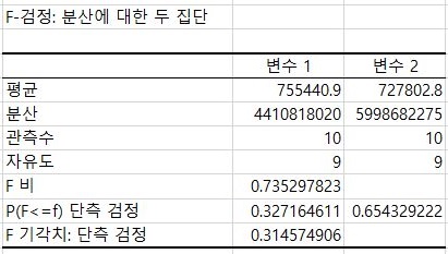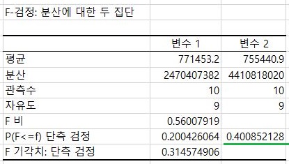 F 검정 결과는 위 스크린샷과 같이 P 값이 0.05를 한참이나 넘어가기 때문에, 일단 이에 대해서는 등분산이 성립한다는 가정으로 해서 앞으로 나아가야 합니다.