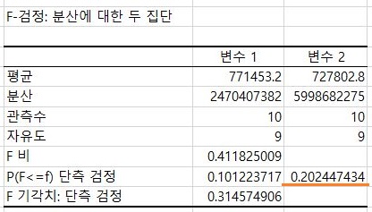 먼저 F 검정을 받아본 결과는 P 값이 0.2로 유의수준 0.05를 한참이나 넘어갔기 때문에, 확실하게 등분산이 성립이 된다는 것을 확인할 수 있었습니다.