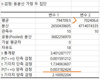 그리고 여기서 등분산이 성립될 경우의 T 검정을 받은 결과로는 위 스크린샷과 같이 일단 유의차가 있으면서 1.5%의 리스크를 짊어진 경우가 손해를 덜 보고 있다는 것을 확인할 수 있었습니다.