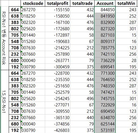 먼저 해야 하는 일로는 1%, 1.5%, 2%의 리스크를 감당해서 나온 손해를 본 종목들을 일단 가지고 오도록 합니다. 여기서 일단 확인이 가능한 것으로는 profit이 모두 마이너스인 것을 가장 먼저 확인할 수 있습니다.