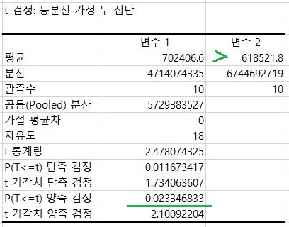 그리고 여기서 등분산이 성립될 경우의 T 검정을 받은 결과로는 위 스크린샷과 같이 일단 유의차가 있으면서 1.5%의 리스크를 짊어진 경우가 손해를 덜 보고 있다는 것을 확인할 수 있었습니다.