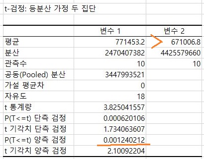 먼저 알아볼 수 있는 것으로는 위 스크린샷과 같이 일단 등분산이 성립하는 가운데 유의수준 0.05를 넘어서 1%의 리스크에서 유의차 있게 손해를 덜 보았다는 것을 볼 수 있습니다.