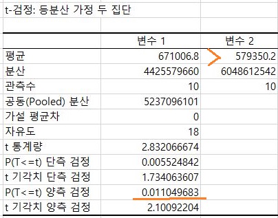 먼저 알아볼 수 있는 것으로는 위 스크린샷과 같이 일단 등분산이 성립하는 가운데 유의수준 0.05를 넘어서 1%의 리스크에서 유의차 있게 손해를 덜 보았다는 것을 볼 수 있습니다.