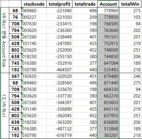 그리고 나서 다음으로 생각할 수 있는 것으로는 1.5%와 2%를 가지고서 얼마나 많은 종목이 일치하는 지를 알아보니, 여기서는 어떻게 100% 종목이 일치한다는 것을 생각할 수 있었습니다. 일렇게 해서 일단 손해를 각각의 매도/매수 룰 별로 알아보는 작업은 끝이 났습니다.