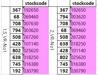 그리고 나서 다음으로 생각할 수 있는 것으로는 1.5%와 2%를 가지고서 얼마나 많은 종목이 일치하는 지를 알아보니, 여기서는 어떻게 100% 종목이 일치한다는 것을 생각할 수 있었습니다. 일렇게 해서 일단 손해를 각각의 매도/매수 룰 별로 알아보는 작업은 끝이 났습니다.