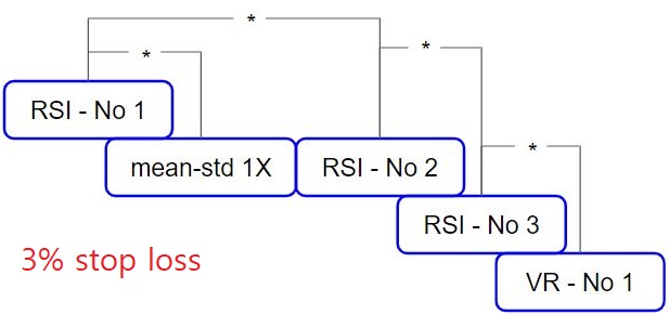 그리고 나서 먼저 3% 스탑 로스의 경우에는 위 스크린샷과 같이 일단, 만들어 보도록 합니다. 우선 RSI를 이용한 No1의 매수/매도 룰과 이동평균선을 이용한 룰의 차이를 비교해 보면......