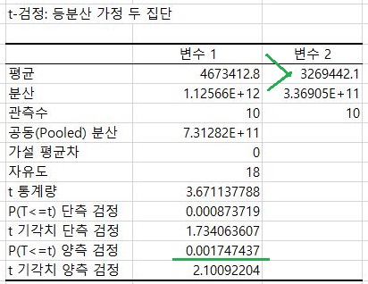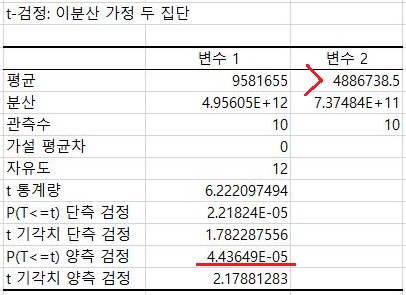 역시나 F 검정 이후에 등분산이 성립한다는 가정 하에서 나온 T 검정을 한 결과가 위 스크린샷과 같이 3%의 결과가 4%의 결과보다 더 많은 수익을 유의차 있게 냈다는 것을 확인할 수 있었습니다.