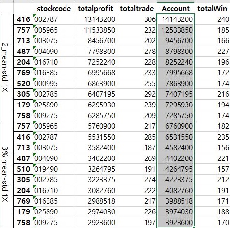 2번째 매도/매수 룰인 이동평균선과 표준편차에 배수 1을 해주는 방식을 한번 각각의 손절매용 %별로 비교하는 단계에 들어가 보아야 합니다. 일단 여기서는 우선 Account별로 한번 비교해 보도록 합니다.
