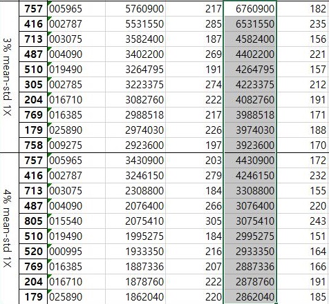 먼저 2%에 비해서 3%의 조건에서 유의차가 있는 가운데 수익이 훨씬 더 감소했다는 것을 확인할 수 있었습니다. 이렇게 해서 이제 다음 조건을 보면........