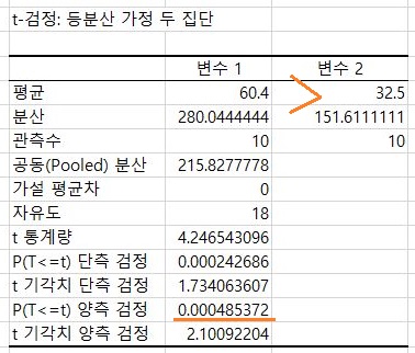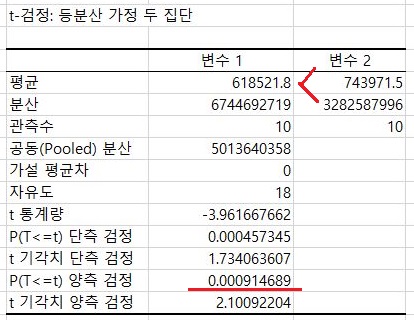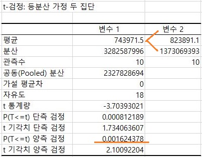 그 다음으로는 위 스크린샷에서 볼 수 있는 것처럼 등분산이 성립한다는 가정하에서 나오는 유의차 검정에서 유의차가 있는 가운데 2% 보다는 3%의 조건에서 손해를 덜 보았다는 것을 볼 수 있습니다.