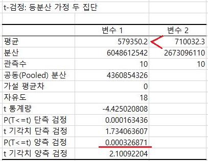일단 F 검정 결과 등분산이 성립한다고 해서, 이에 따른 T 검정을 했고, 그 결과는 유의차가 있는 상황에서 3%의 조건에서 손해를 덜 보았다는 것을 알 수 있었습니다.