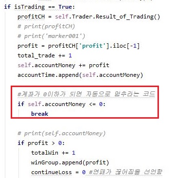 먼저 위 스크린샷을 보시면 코드를 하나 더 추가해 주는데, 일단 이전에 나왔는 마이너스 계좌는 아무리 생각해도 일단 잔고가 0이 되었는데도 계속해서 거래가 일어나서 벌어진 것이라고 생각을 했습니다.
