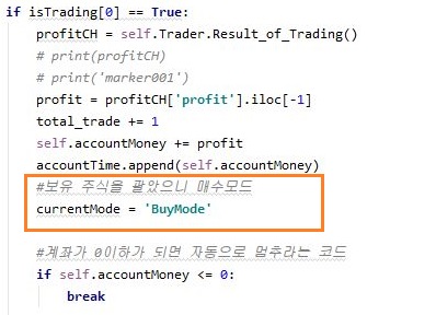 그리고 나서 주식을 팔았는 상황이 나오면, 위 스크린샷에서 볼 수 있는 것처럼 일단 BuyMode로 전환을 시켜 주도록 합니다.