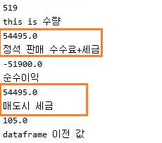 그래서 일단 이 손해가 왜 이렇게도 나오는지 일단 알아보기 위해서, print함수를 이용해서 한번 알아보니까, 일단 순수이익에 거의 근접하게 매도시 세금이 나오는 것을 확인할 수 있었습니다. 그럼 매수시에 수수료를 냈으니, 그것까지 고려하면 상당한 손해임이 분명합니다.