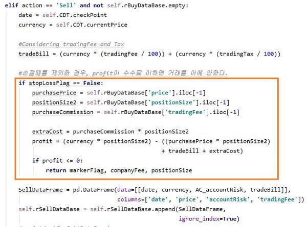 그리고 나서 다음으로 진행하고자 하는 것은 일명 입구컷이라고 해야 할까요? 일단 Sell 신호가 왔으면, 계산을 해서 수수료와 세금 이상을 못 건질것 같으면 아예 거래를 하지 말라고 하는 것 입니다. 그런데 이런 것에서 손절매는 예외로 처리를 해 두었습니다.