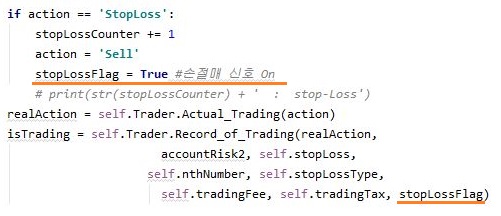 먼저 StopLoss라는 신호가 나오면 이걸 Sell 신호로 전환을 하는데, 이 경우에 있어선느 그냥, 손절매 한다는 신호를 주도록 합니다. 이렇게 해서 손절매 신호인 True가 전달되면, 수수료와 세금을 비교하는 과정없이 그냥 판매가 되는 것 입니다.