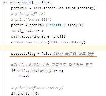 이렇게 해서 Sell이 처리가 되고 나면, 무조건 이 손절매 신호는 다시 False로 바꾸어 줄 필요가 있습니다. 이 다음에는 일반적인 Sell신호인지 아닌지 따져야 하기 때문입니다.