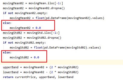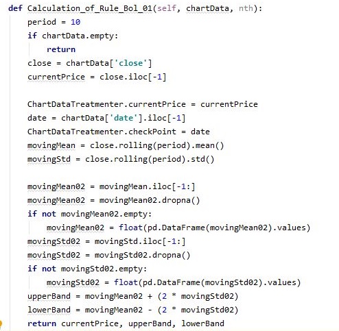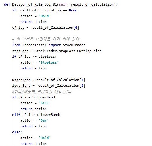 그리고 나서 다음으로 시도할 것으로는 위 스크린샷에서 볼 수 있는 것처럼, 일단 결정을 하는 과정을 거쳐야 하는데, 일단 기본적으로 그저 상한선 (upperBand)를 넘어가면 팔고, 하한선 (lowerBand)를 넘어가면 사도록 프로그램을 짜 놓도록 했습니다.