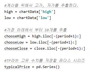 그리고 나서 이 계산을 하기 위해서 고가와 저가를 가지고 오도록 하고, 그 다음에 필요한 끝에서 10개만 추출하도록 합니다. 이렇게 하고 나서, Typical Price를 저장하기 위한 판다스 시리즈를 만들어 주도록 합니다.