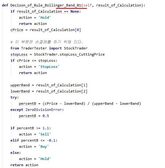 이런 작업을 위해서도 일단 계산을 위한 메서드를 하나지만, 특별히 결정을 위한 메서드를 만들어 주도록 합니다. 일단 내용차제는 기존의 Bollinger Band와 차이가 없지만, 그래도 세세한 지수에 대한 설명이 다르기 때문에 이에 대해서 따로 메서드를 만들어 주었습니다.