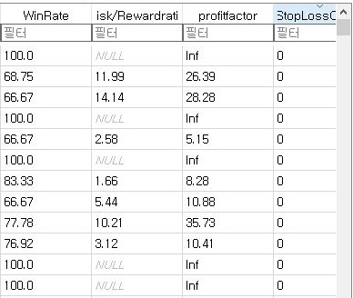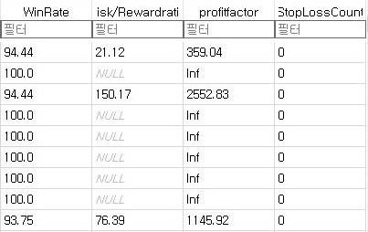 일단 이런 게 말이 되느냐 하면, 우선 승률부터 90퍼센트 대를 넘어가는 시점에서 무언가가 말이 안되기는 안되는 듯 합니다. 그리고 나서 다음으로 살펴보아야 하는 것으로는 위 스크린샷에서 볼 수 있는 것처럼 손절매 횟수가 완전히 0이라는 결과를 얻을 수 있었습니다.