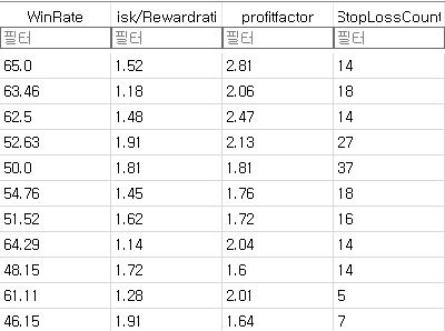 일단 이런 게 말이 되느냐 하면, 우선 승률부터 90퍼센트 대를 넘어가는 시점에서 무언가가 말이 안되기는 안되는 듯 합니다. 그리고 나서 다음으로 살펴보아야 하는 것으로는 위 스크린샷에서 볼 수 있는 것처럼 손절매 횟수가 완전히 0이라는 결과를 얻을 수 있었습니다.