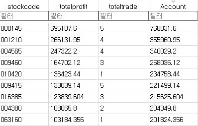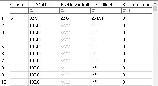 여기서 일단 수익이 좋은 종목들은 어째 손절매도 상당히 적은 것을 확인할 수 있었습니다. 일단 그리고 나서 승률도 좋은 애들은 좋지만, 낮은 종목이 2개 보이는 듯 합니다.