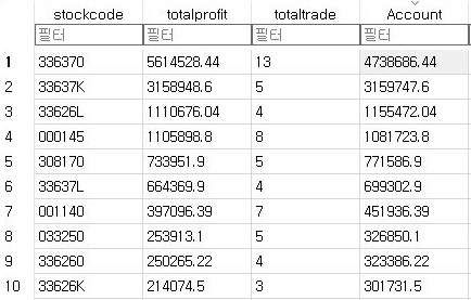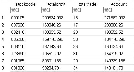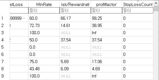 여기서 일단 수익이 좋은 종목들은 어째 손절매도 상당히 적은 것을 확인할 수 있었습니다. 일단 그리고 나서 승률도 좋은 애들은 좋지만, 낮은 종목이 2개 보이는 듯 합니다.