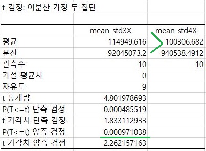 그런데 3배와 5배의 차이에는 유의차가 0.5이면 있을까, 상정했는 0.05에서는 없다고 나오는 것을 확인할 수 있었습니다. 일단 줄어들긴 4배에서 줄어는 들었는데, 이게 유의차가 없다는 상황이기는 합니다.
