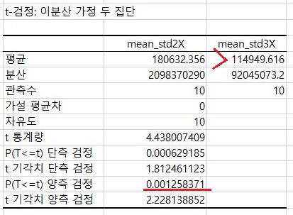 그리고 나서 표준편차에 2배를 해준 결과와 3배를 해준 결과를 한번 비교해 보도록 합니다. 우선 최종적으로 나온 계좌의 액수를 가지고서 통계학적 처리를 시작하기 위해서 F 검정 부터 먼저 들어가도록 합니다.