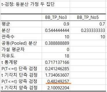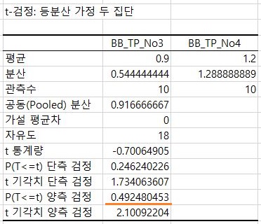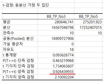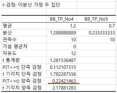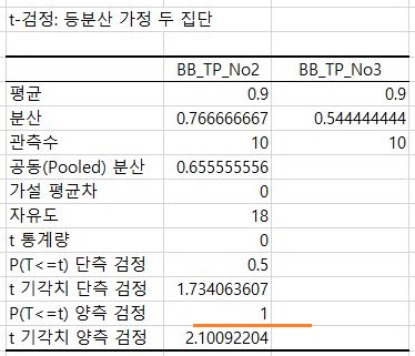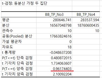 그래서 다른 것은 없는지 한번 더 깊이 살펴보기 위해서, 2번째와 4번째 조건을 비교해 보았습니다만, F 검정에 이은 T 검정 결과는 역시나 아무런 차이가 없었습니다.