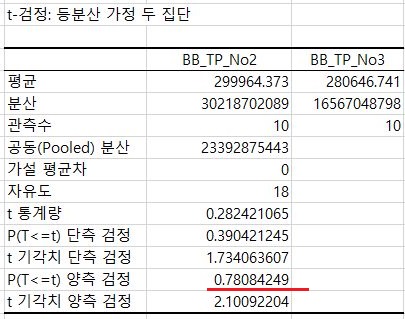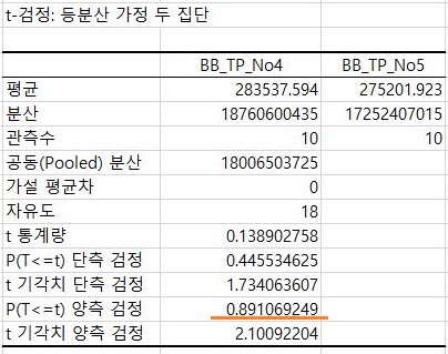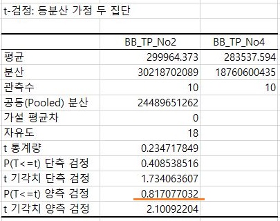 그래서 다른 것은 없는지 한번 더 깊이 살펴보기 위해서, 2번째와 4번째 조건을 비교해 보았습니다만, F 검정에 이은 T 검정 결과는 역시나 아무런 차이가 없었습니다.