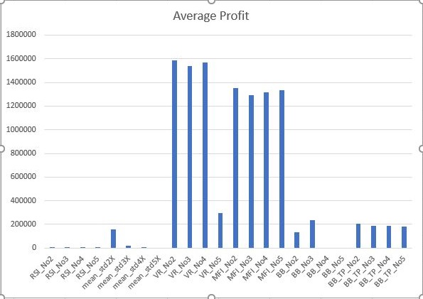 먼저 평균적인 수익에 대해서 한번 비교해 보았는데, 그나마 이동평균선과 표준편차를 2배 해준 결과와 Bollinger Band가 그럭저럭 선전했지만, VR과 MFI지수의 이익에 비하면 상당히 떨어지는 것을 볼 수 있습니다.