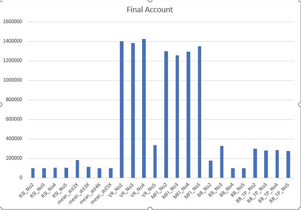 그리고 나서 다음으로 볼 수 있는 것으로는 위 스크린샷과 같이 일단 마지막 Account를 바탕으로 해서 한번 작업을 하기 위해서 그래프로 비교해 보았습니다. 여기서도 역시나 VR 지수와 MFI 지수를 가지고서 거래를 하였는 결과가 가장 좋은 결과를 보여주고 있습니다.