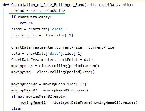 다음으로는 간단한 버젼의 Bollinger Band를 계산하기 위한 다음의 작업에도 들어가 보도록 합니다. 여기서도 역시나 숫자로 되어 있는 변수를 self붙은 변수로 바꾸어 주도록 합니다.