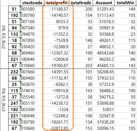 마지막으로 손절매 횟수입니다만, 이것도 절대 적다고 말할 수 없습니다. 아무래도 여전히 저 많은 손절매 때문에 계속해서 무언가 않 좋은 상황이 이어지는 것이 아닌가 하는 생각이 듭니다. 일단 다음의 조건에서는 한번 10%의 stop loss 기준을 세우고 나서, 작업을 해 봐야 할듯 합니다.