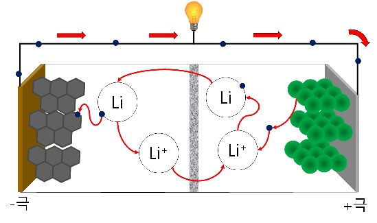 먼저 설명할 것은 전지에서 전기가 발생을 할 때는, 전자를 받아들이는 반응인 환원반응을 일으키는 '양극'과 전자를 방출하는 산화반응을 일으키는 '음극'이 필요합니다., 여기서 리튬이온이 어떤 역할을 하느냐 하면, 양극에서 전자를 방출한 다음에, 음극으로 가서는 전자를 가지고 오는 일종의 셔틀역할을 하게 됩니다.