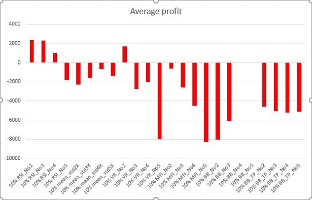 이렇게 된 김에 일단 비교분석을 하기 위해서, 먼저 이익의 평균에 대해서 한번 그래프를 그려 보았지만, 4개의 매도/매수 룰이 수익은 +를 낸 것으로 나왔습니다. 이럼에도 불구하고 어디에서 무엇이 잘못되었는지 몰라도 일단 계좌는 마이너스로 나왔습니다.