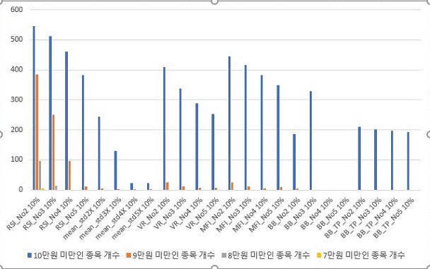 그렇게 해서 이제 5%와 10% 손절매의 조건을 한번 비교해 보고자 했습니다. 일단 너무 한꺼번에 비교를 하게 되면 번잡한 면이 있어서 하는 수 없이 각각의 매도/매수 조건에서 한번 비교를 해 보아야 했습니다. 일단 RSI기반 룰에서 먼저 5%를 세우고 다음에 10%를 세웠는데, 우선 손해를 보는 종목의 갯수는 확실하게 내려갔고, 이익을 보는 종목의 갯수는 확실하게 늘어났습니다.