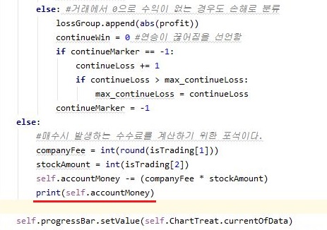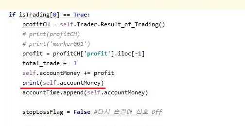그리고 나서 먼저 위 스크린샷과 같이 현금이 어떻게 변하는지 print함수를 이용해서 알아보고자 합니다. 그런데 위치가 잘못되었는지 하나도 찍히지 않았습니다.