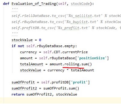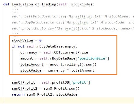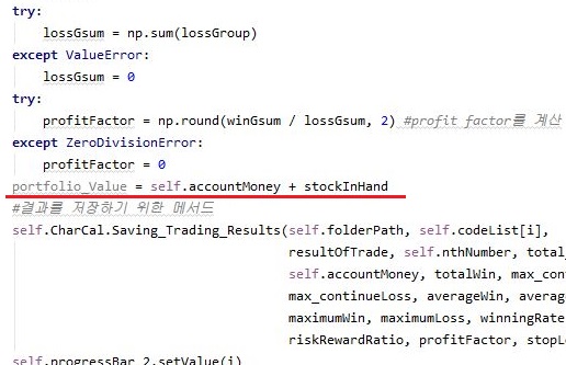지난번 포스팅에서도 문제는 100% 해결은 되지 않았고, 이래저래 Portfolio Value라는 것에 대해서 생각을 해봐야 하는 단계에 왔었는데, 겨우겨우 실마리를 하나 잡기는 잡았습니다. 아무튼 간에 이번 작업을 하기 위해서는 어떻게 마지막에 작업이 끝날때 남아 있는 매수 수량을 계산해서 가치에 집어넣고자 하는 작업을 진행해 보고자 합니다.