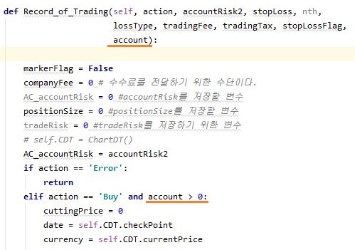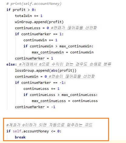 그리고 나서 거래를 하다가 완전히 계좌가 0이나 그 이하가 되면 아예 거래를 정지하는 브레이크를 설정해 주도록 만들어 주는 식으로 작업을 이어나가도록 합니다.
