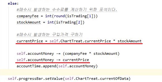 지난번 포스팅에서 올린 문제점이 하나 있었는데, 그건 바로 왜인지 자본금은 10만원인데, 1만원짜리 주식을 300회 넘게 매수를 했다는 것 입니다. 이건 그야말로 주식을 살 때 마다 수수료가 지불이 되도록 만들기는 했지만, 이 작업을 하면서 무언가 문제가 있다는 뜻 입니다.