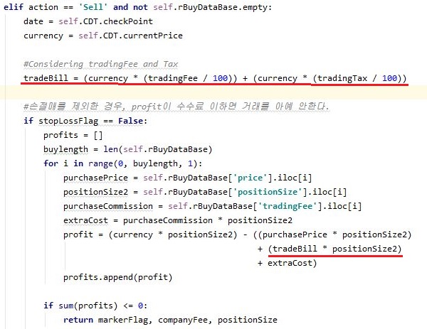 그리고 나서 등믕로 해야 하는 것은 매도를 하는 도중에 수수료 컷에서 너무 세금과 수수료의 비율을 낮게 책정해 주었습니다. 이걸 어떻게 해결하기 위해서 위 스크린샷에서 볼 수 있는 것철머 일단 positionSize를 곱해 주도록 합니다.