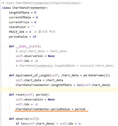 그리고 나서 메인이 되는 py파일로 와서는 위 스크린샷에서 볼 수 있는 것처럼 일단 기존에는 아무것도 없던 reset메서드에서 period를 의미하는 변수를 집어 넣어 주도록 합니다.