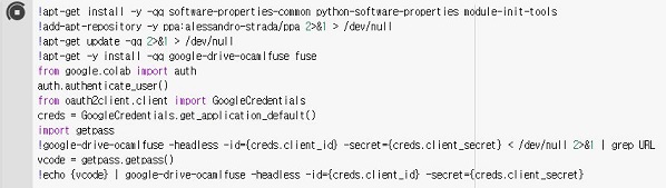 그리고 나서 구글 드라이브 안에 있는 폴더로 움직이기 위한 일련의 명령어를 하나하나 입력해 보도록 합니다. 한꺼번에 해도 될까 모르겠습니다만, 혹시나 모를 일을 위해서 한줄 한줄 실행을 시켜 보는 것 입니다.
