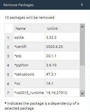 그래서 안전하다고 생각이 되는 아나콘다 네비게이터에서 그냥 제거하기 위해서 일단 sqlite3만 선택을 하고 제거하는 옵션을 눌렀습니다만..........